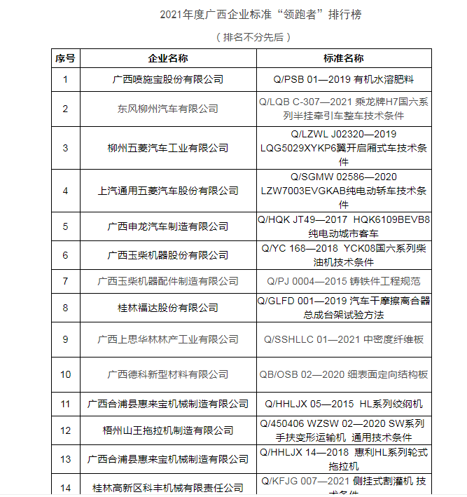 中國質(zhì)量新聞網(wǎng)訊 2021年12月27日,廣西壯族自治區(qū)標(biāo)準(zhǔn)技術(shù)研究院正式發(fā)布2021年度廣西企業(yè)標(biāo)準(zhǔn)“領(lǐng)跑者”榜單,防城港市上思縣轄區(qū)內(nèi)的廣西上思華林林產(chǎn)工業(yè)有限公司建立的企業(yè)標(biāo)準(zhǔn)入圍2021年度廣西企業(yè)標(biāo)準(zhǔn)“領(lǐng)跑者”排行榜榜單。