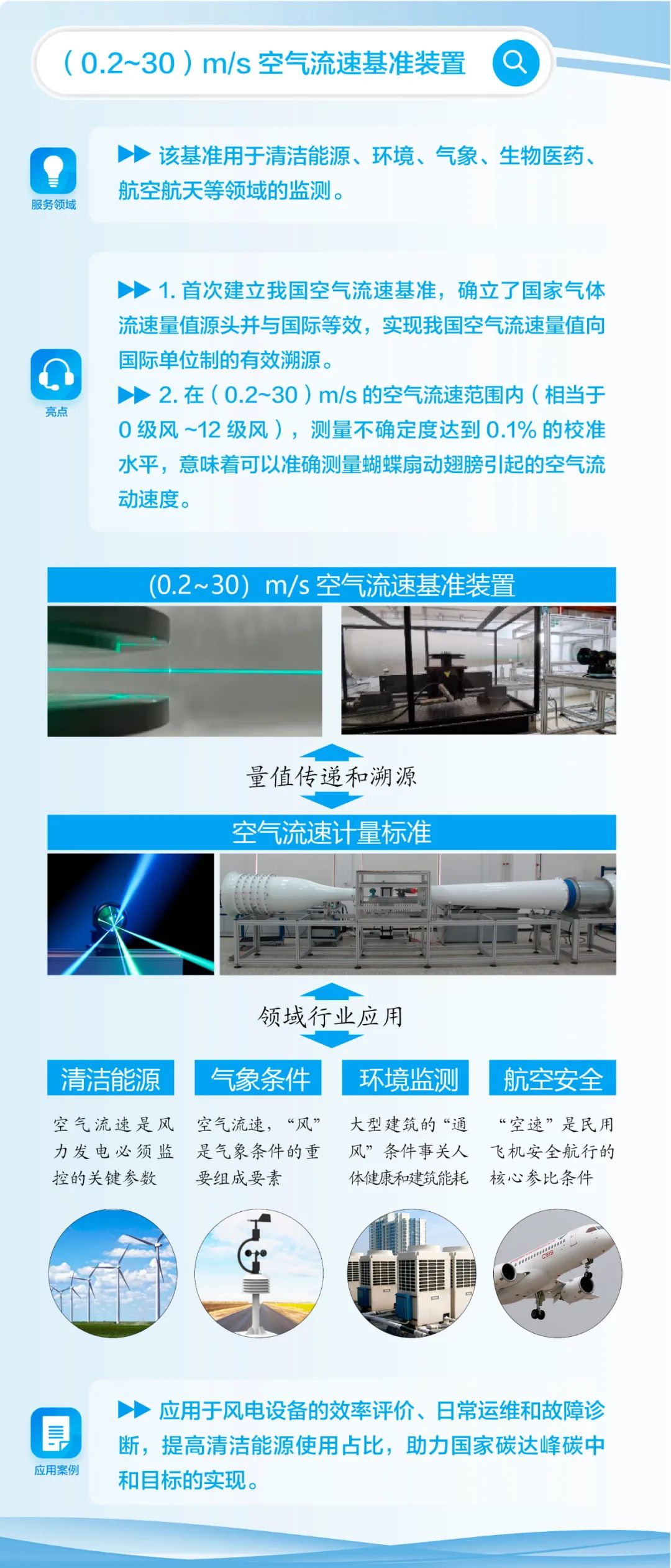 在服務(wù)風(fēng)電產(chǎn)業(yè)、助推國家能源結(jié)構(gòu)調(diào)整、助力國家“雙碳”目標(biāo)實現(xiàn)方面,風(fēng)速的準(zhǔn)確計量至關(guān)重要。此外,大氣環(huán)境監(jiān)測、室內(nèi)通風(fēng)環(huán)境質(zhì)量監(jiān)測、安全生產(chǎn)監(jiān)管領(lǐng)域、氣象災(zāi)害預(yù)報、生物制藥等,都需要空氣流速的準(zhǔn)確計量。而空氣流速計量基準(zhǔn)裝置是準(zhǔn)確測量該量值的前提和保障。