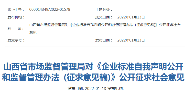 山西省市場(chǎng)監(jiān)督管理局對(duì)《企業(yè)標(biāo)準(zhǔn)自我聲明公開(kāi)和監(jiān)督管理辦法?(征求意見(jiàn)稿)》公開(kāi)征求社會(huì)意見(jiàn)