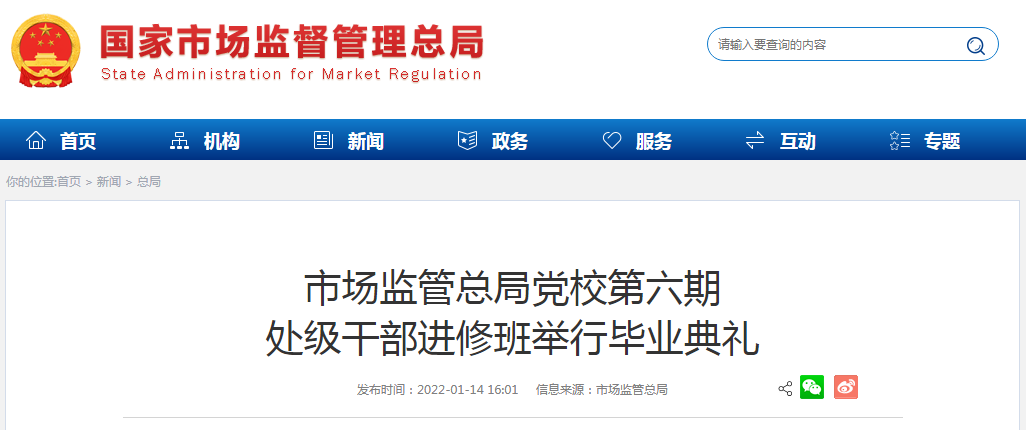 1月13日,中央黨校中央和國家機(jī)關(guān)分校國家市場監(jiān)督管理總局黨校第六期處級干部進(jìn)修班舉行畢業(yè)典禮??偩贮h組成員、副局長,總局直屬機(jī)關(guān)黨委書記,總局黨校校長田世宏出席畢業(yè)典禮并講話。
