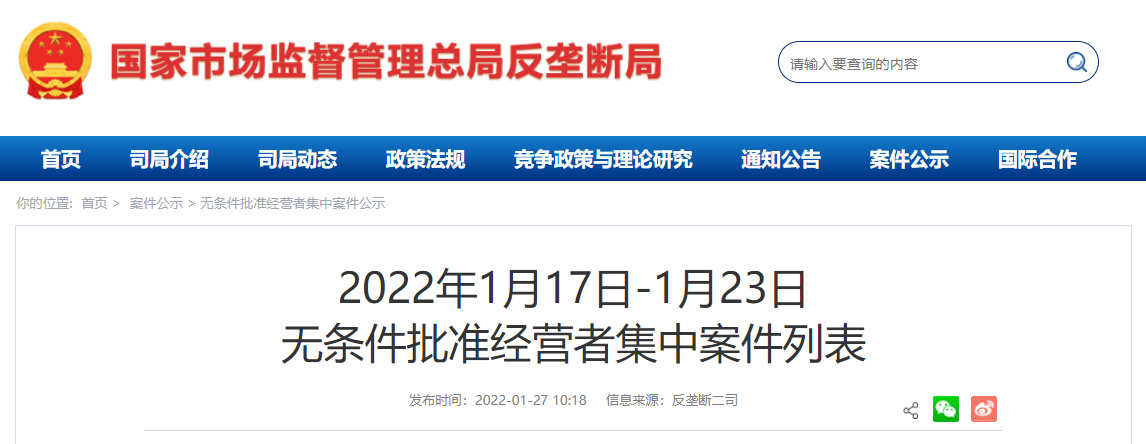 18 | 華潤五豐肉類投資(深圳)有限公司與寧波農(nóng)副產(chǎn)品物流中心有限公司新設合營企業(yè)案 | 華潤五豐肉類投資(深圳)有限公司,寧波農(nóng)副產(chǎn)品物流中心有限公司 | 2022年1月21日 |