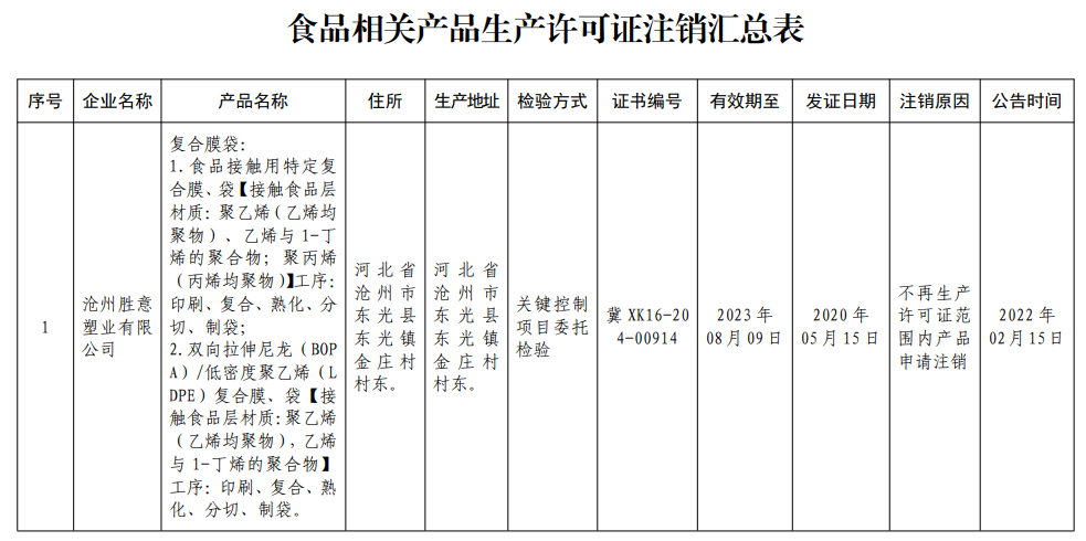 中國質(zhì)量新聞網(wǎng)訊 2月16日,河北省市場監(jiān)督管理局網(wǎng)站發(fā)布公告稱,根據(jù)相關(guān)法律法規(guī),滄州勝意塑業(yè)有限公司食品相關(guān)產(chǎn)品生產(chǎn)許可事項符合注銷條件,現(xiàn)予以注銷。