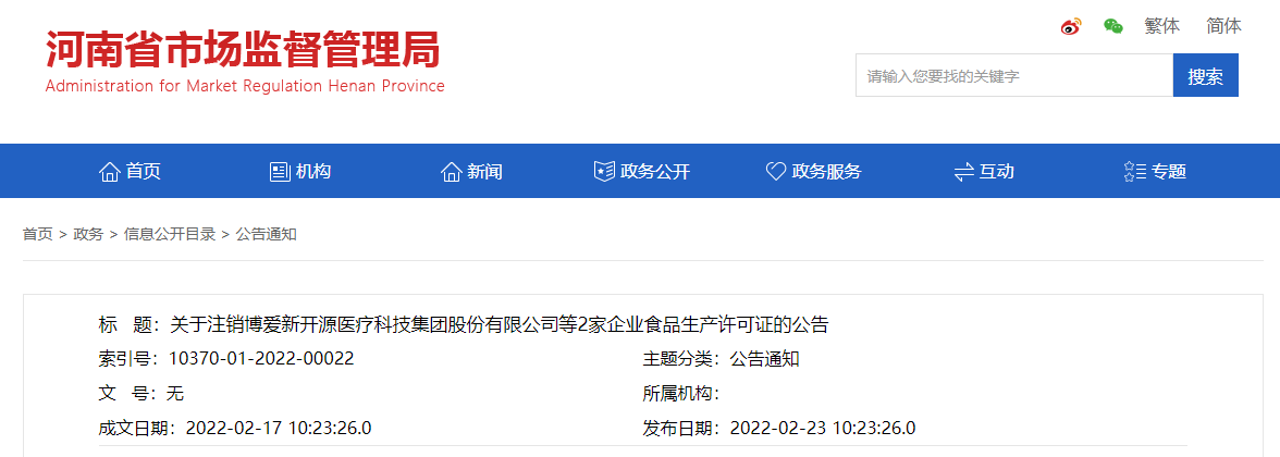 中國質(zhì)量新聞網(wǎng)訊 2月23日,河南省市場(chǎng)監(jiān)督管理局網(wǎng)站發(fā)布關(guān)于注銷博愛新開源醫(yī)療科技集團(tuán)股份有限公司等2家企業(yè)食品生產(chǎn)許可證的公告。