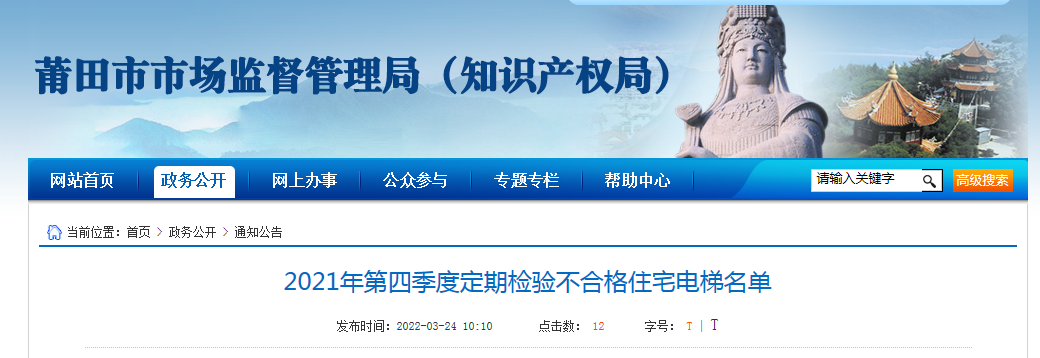 中國質量新聞網(wǎng)訊 3月24日,福建省莆田市市場監(jiān)督管理局網(wǎng)站公布2021年第四季度定期檢驗不合格住宅電梯名單。為促進電梯安全管理水平和維保質量運行質量提升,落實電梯使用管理單位及其維保單位的主體責任,保障電梯安全使用,結合福建省電梯維保質量信用體系建設方案要求,現(xiàn)對莆田市2021年第四季度住宅電梯總體定期檢驗情況,以及定期檢驗不合格住宅電梯名單公布如下。