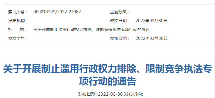 中國質(zhì)量新聞網(wǎng)訊 3月30日,山西省市場監(jiān)管局網(wǎng)站發(fā)布關(guān)于開展制止濫用行政權(quán)力排除、限制競爭執(zhí)法專項(xiàng)行動的通告。