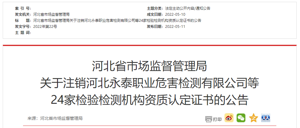 中國質(zhì)量新聞網(wǎng)訊 5月11日,河北省市場監(jiān)督管理局網(wǎng)站發(fā)布公告稱,河北永泰職業(yè)危害檢測有限公司等24家機(jī)構(gòu)申請注銷其檢驗檢測機(jī)構(gòu)資質(zhì)認(rèn)定證書。依據(jù)《檢驗檢測機(jī)構(gòu)資質(zhì)認(rèn)定管理辦法》第三十一條第三款之規(guī)定,準(zhǔn)予注銷其檢驗檢測機(jī)構(gòu)資質(zhì)認(rèn)定證書。注銷機(jī)構(gòu)名單及證書號如下: