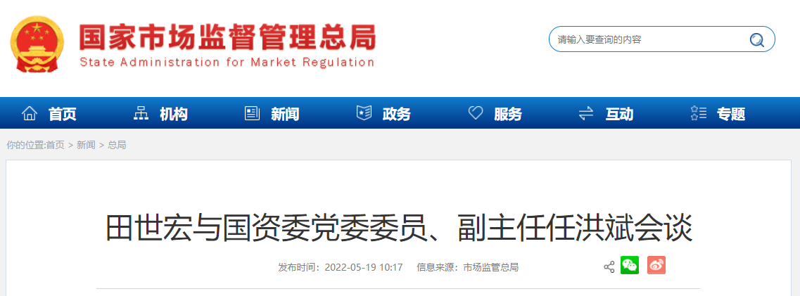 5月17日,市場監(jiān)管總局黨組成員、副局長,標(biāo)準(zhǔn)委主任田世宏赴國資委,與國資委黨委委員、副主任任洪斌進(jìn)行會談,雙方就進(jìn)一步加強(qiáng)質(zhì)量、標(biāo)準(zhǔn)化和特種設(shè)備安全等領(lǐng)域合作,助力中央企業(yè)建設(shè)世界一流企業(yè)等進(jìn)行了深入交流。
