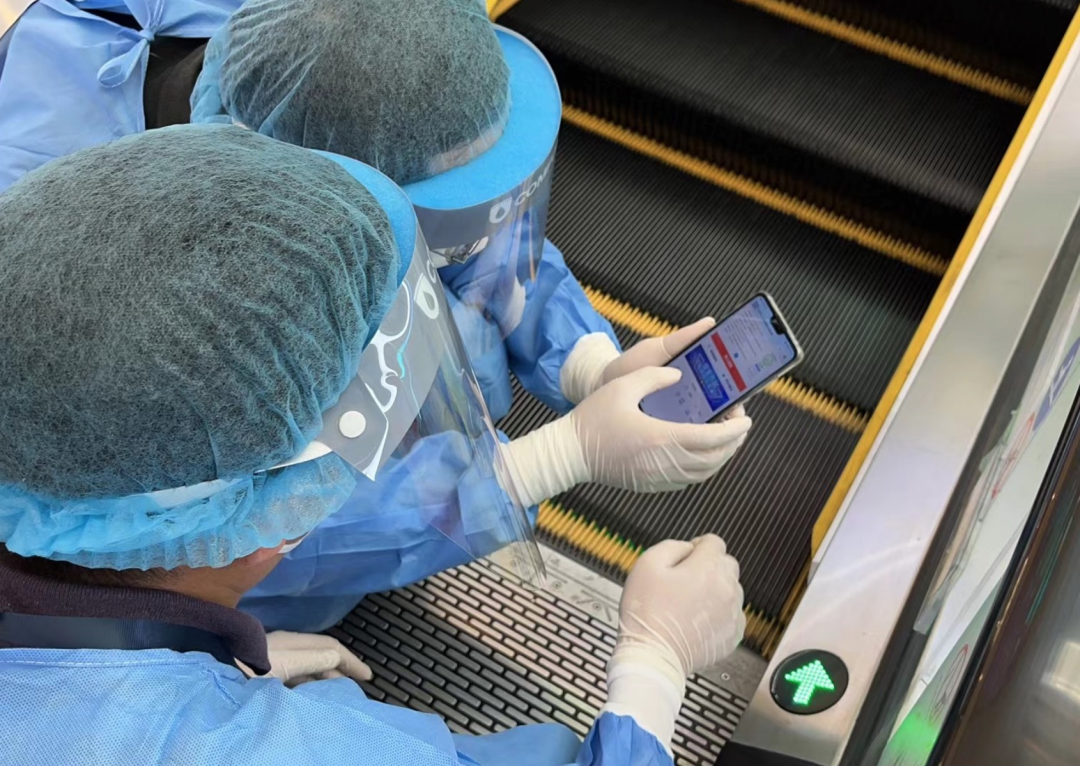 執(zhí)法人員掃碼檢查電梯維保情況