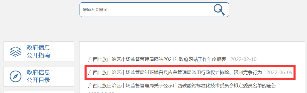 中國(guó)質(zhì)量新聞網(wǎng)訊 據(jù)廣西壯族自治區(qū)市場(chǎng)監(jiān)管局網(wǎng)站消息,2020年8月18日,廣西壯族自治區(qū)市場(chǎng)監(jiān)管局對(duì)玉林市博白縣應(yīng)急管理局涉嫌濫用行政權(quán)力排除、限制競(jìng)爭(zhēng)行為進(jìn)行立案調(diào)查。