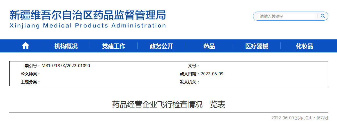 中國質(zhì)量新聞網(wǎng)訊 6月9日,新疆維吾爾自治區(qū)藥品監(jiān)督管理局網(wǎng)站發(fā)布藥品經(jīng)營企業(yè)飛行檢查情況一覽表。