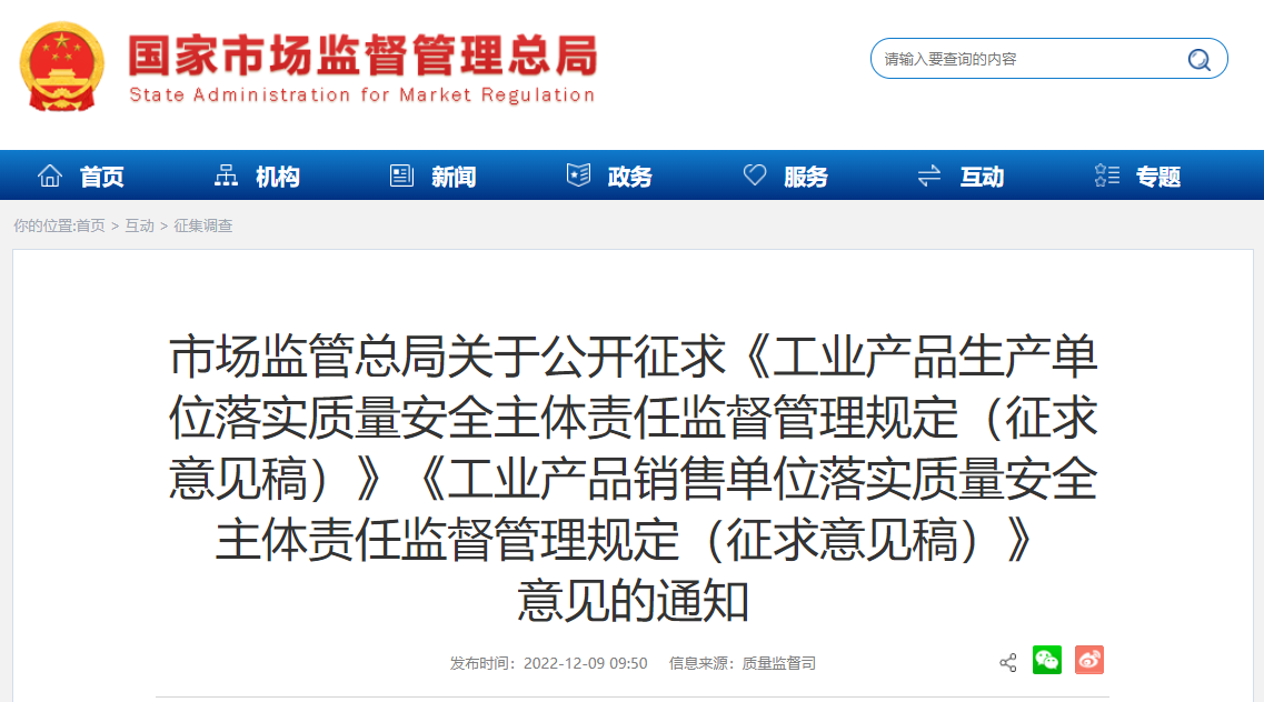 市場(chǎng)監(jiān)管總局關(guān)于公開(kāi)征求《工業(yè)產(chǎn)品生產(chǎn)單位落實(shí)質(zhì)量安全主體責(zé)任監(jiān)督管理規(guī)定(征求意見(jiàn)稿)》《工業(yè)產(chǎn)品銷(xiāo)售單位落實(shí)質(zhì)量安全主體責(zé)任監(jiān)督管理規(guī)定(征求意見(jiàn)稿)》意見(jiàn)的通知