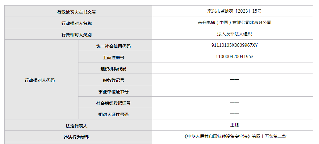 中國質量新聞網查詢企查查平臺發(fā)現(xiàn),2022年8月,蒂升電梯(中國)有限公司北京分公司還被北京市住房和城鄉(xiāng)建設委員會罰款2萬元。