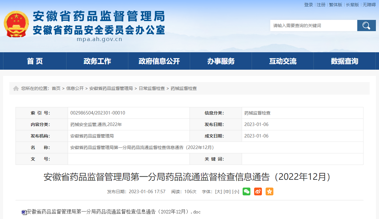 中國質(zhì)量新聞網(wǎng)訊 近日,安徽省藥品監(jiān)督管理局第一分局發(fā)布2022年12月藥品流通監(jiān)督檢查信息。