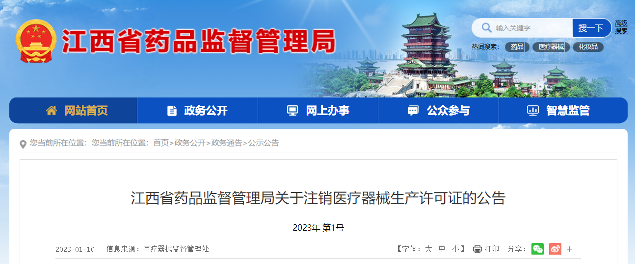 中國質(zhì)量新聞網(wǎng)訊 2023年1月10日,江西省藥品監(jiān)督管理局網(wǎng)站發(fā)布關(guān)于注銷醫(yī)療器械生產(chǎn)許可證的公告(2023年 第1號)。