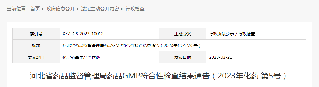 河北省藥品監(jiān)督管理局藥品GMP符合性檢查結(jié)果通告(2023年化藥 第5號)