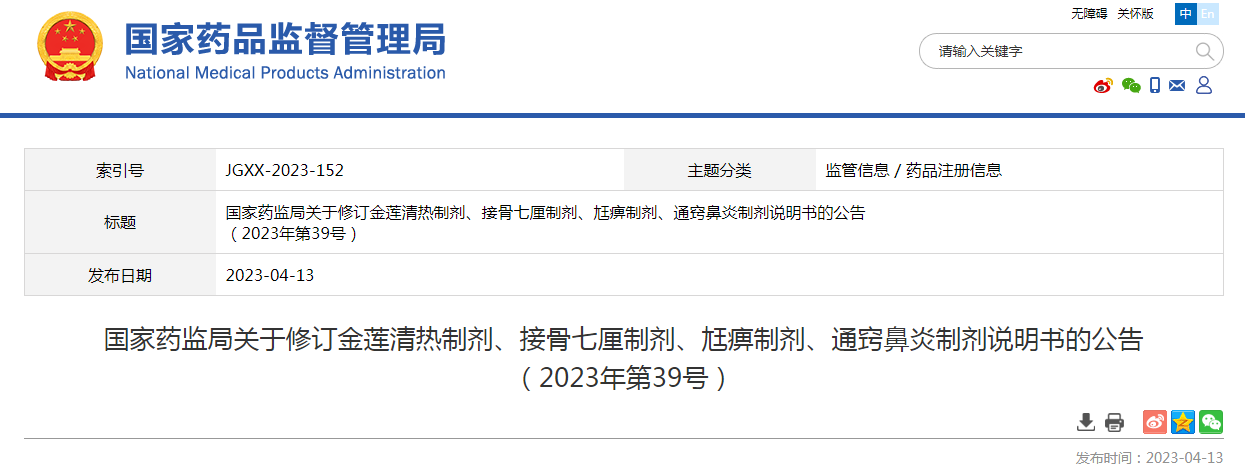 國家藥監(jiān)局關(guān)于修訂金蓮清熱制劑、接骨七厘制劑、尪痹制劑、通竅鼻炎制劑說明書的公告(2023年第39號)