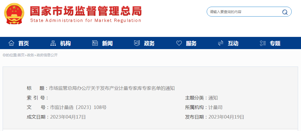 市場監(jiān)管總局辦公廳關于發(fā)布產(chǎn)業(yè)計量專家?guī)鞂<颐麊蔚耐ㄖ?/span>