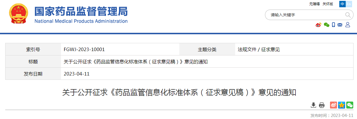 關于公開征求《藥品監(jiān)管信息化標準體系(征求意見稿)》意見的通知