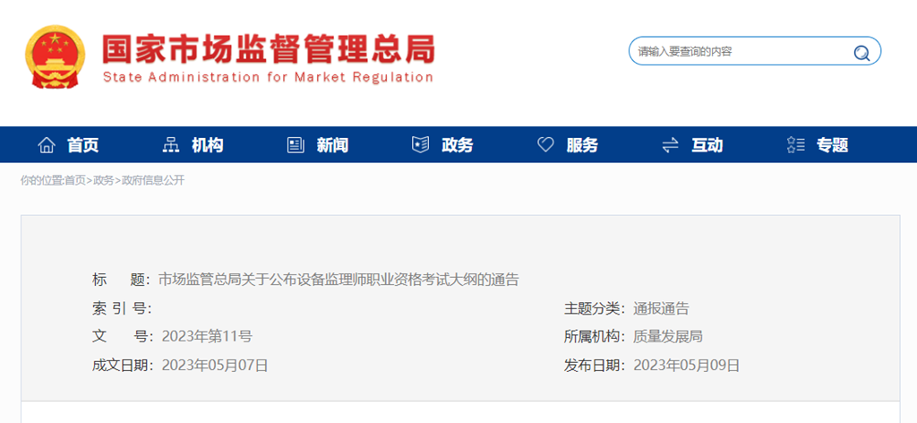 根據(jù)《市場(chǎng)監(jiān)管總局 人力資源社會(huì)保障部關(guān)于印發(fā)〈設(shè)備監(jiān)理師職業(yè)資格制度規(guī)定〉〈設(shè)備監(jiān)理師職業(yè)資格考試實(shí)施辦法〉的通知》(國(guó)市監(jiān)質(zhì)發(fā)〔2023〕13號(hào)),市場(chǎng)監(jiān)管總局組織制定了《設(shè)備監(jiān)理師職業(yè)資格考試大綱(2023)》,經(jīng)人力資源社會(huì)保障部審定,現(xiàn)予公布。