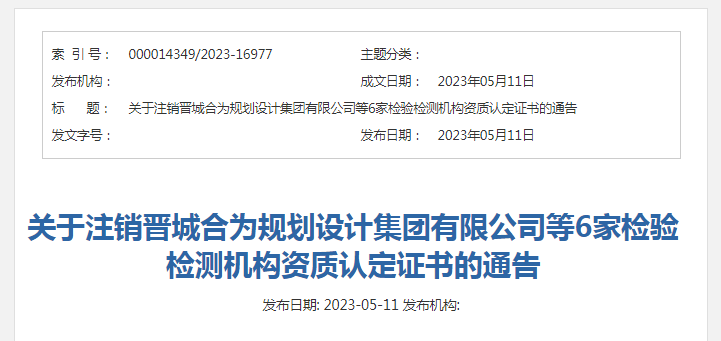 關(guān)于注銷晉城合為規(guī)劃設(shè)計(jì)集團(tuán)有限公司等6家檢驗(yàn)檢測(cè)機(jī)構(gòu)資質(zhì)認(rèn)定證書的通告