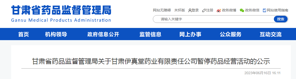 甘肅伊真堂藥業(yè)有限責(zé)任公司因自身原因,自公示日起至2023年11月24日暫停藥品經(jīng)營,停業(yè)期間不得開展藥品經(jīng)營活動,請社會各界予以監(jiān)督。