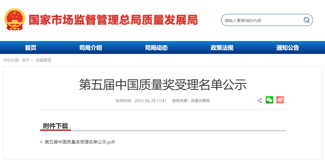 第五屆中國(guó)質(zhì)量獎(jiǎng)受理名單公示