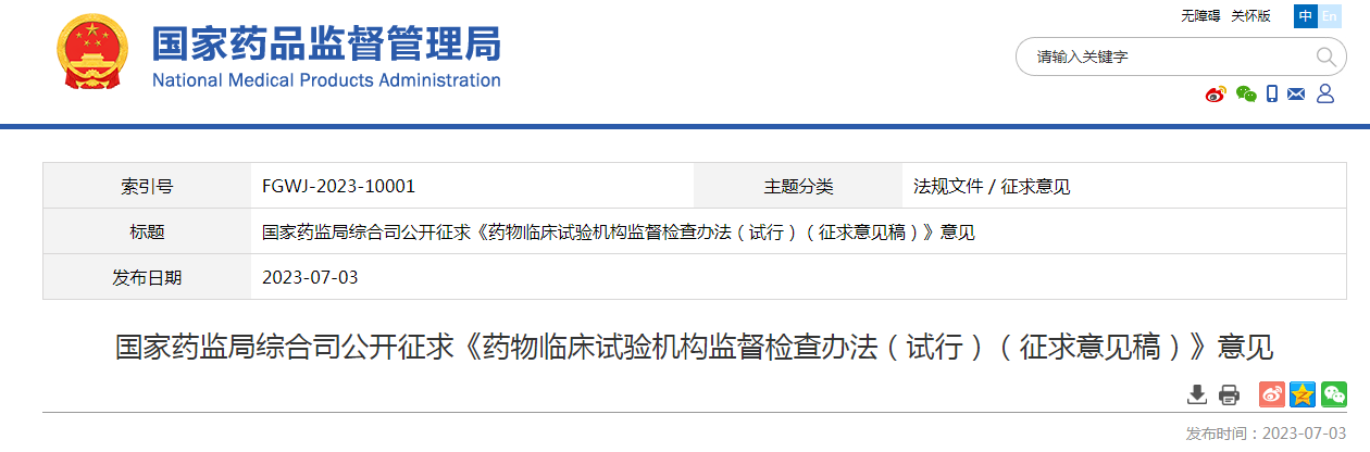 為進一步規(guī)范藥物臨床試驗機構(gòu)監(jiān)督檢查工作,加強藥物臨床試驗管理,國家藥監(jiān)局組織起草了《藥物臨床試驗機構(gòu)監(jiān)督檢查辦法(試行)(征求意見稿)》(附件1),現(xiàn)公開征求意見。