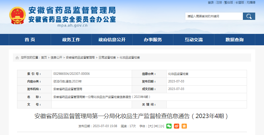 | 安徽省藥品監(jiān)督管理局第一分局化妝品生產(chǎn)監(jiān)督檢查信息通告(2023年4期) | ||||||||||