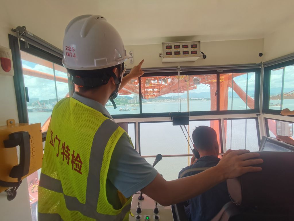為保障該“重器”安全快速地投入使用,廈門市特檢院根據(jù)大型起重設(shè)備的特性,科學(xué)設(shè)置“兩步走”檢驗(yàn)方案。第一步對(duì)該岸橋進(jìn)行靜載試驗(yàn)、動(dòng)載試驗(yàn)、額載試驗(yàn)和空載試驗(yàn)等性能試驗(yàn),嚴(yán)格驗(yàn)證起重機(jī)在各種載荷條件下的各項(xiàng)指標(biāo);第二步對(duì)設(shè)備部件進(jìn)行分項(xiàng)“體檢”,主要包括起重機(jī)的通道尺寸、吊具、各連鎖保護(hù)裝置、露天防風(fēng)措施、電氣控制系統(tǒng)和安全保護(hù)系統(tǒng),以及起升機(jī)構(gòu)、前臂梁俯仰機(jī)構(gòu)、大小車運(yùn)行軌道等。同時(shí)需檢驗(yàn)登機(jī)梯和檢修吊等附屬設(shè)備是否符合標(biāo)準(zhǔn)。