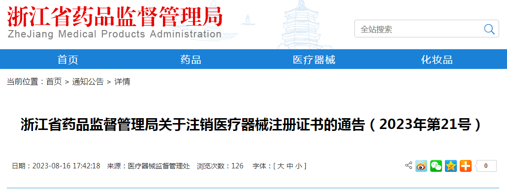 浙江省藥品監(jiān)督管理局關(guān)于注銷醫(yī)療器械注冊證書的通告(2023年第21號)