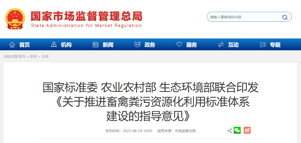 為貫徹落實黨中央、國務(wù)院加快推動畜禽糞污資源化利用的決策部署,充分發(fā)揮標(biāo)準(zhǔn)對畜禽糞污資源化利用的規(guī)范和引領(lǐng)作用。近日,國家標(biāo)準(zhǔn)委、農(nóng)業(yè)農(nóng)村部、生態(tài)環(huán)境部聯(lián)合印發(fā)《關(guān)于推進(jìn)畜禽糞污資源化利用標(biāo)準(zhǔn)體系建設(shè)的指導(dǎo)意見》(以下簡稱《指導(dǎo)意見》)。這是國家層面首次圍繞全鏈條畜禽糞污資源化利用提出的標(biāo)準(zhǔn)體系建設(shè)指導(dǎo)意見。