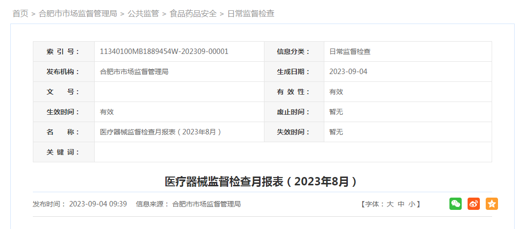 中國質(zhì)量新聞網(wǎng)訊 9月4日,合肥市市場監(jiān)督管理局網(wǎng)站發(fā)布醫(yī)療器械監(jiān)督檢查月報表(2023年8月)。