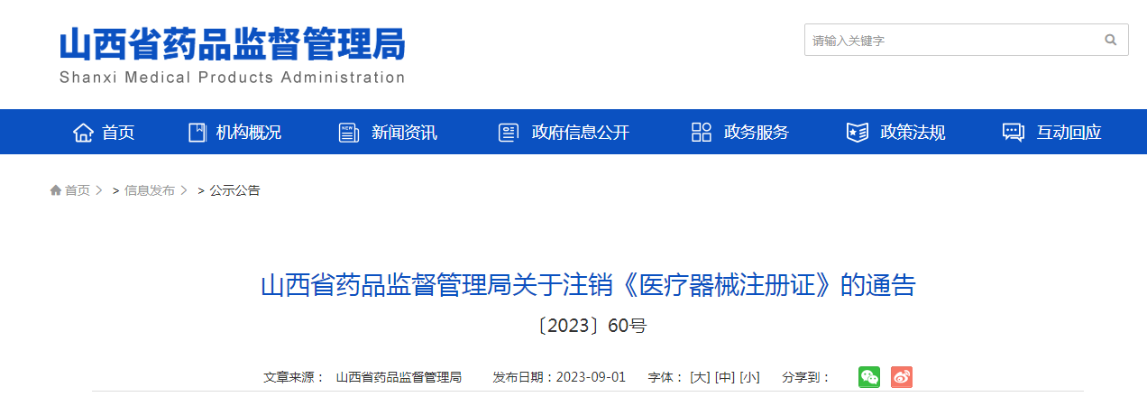 山西省藥品監(jiān)督管理局關(guān)于注銷《醫(yī)療器械注冊(cè)證》的通告