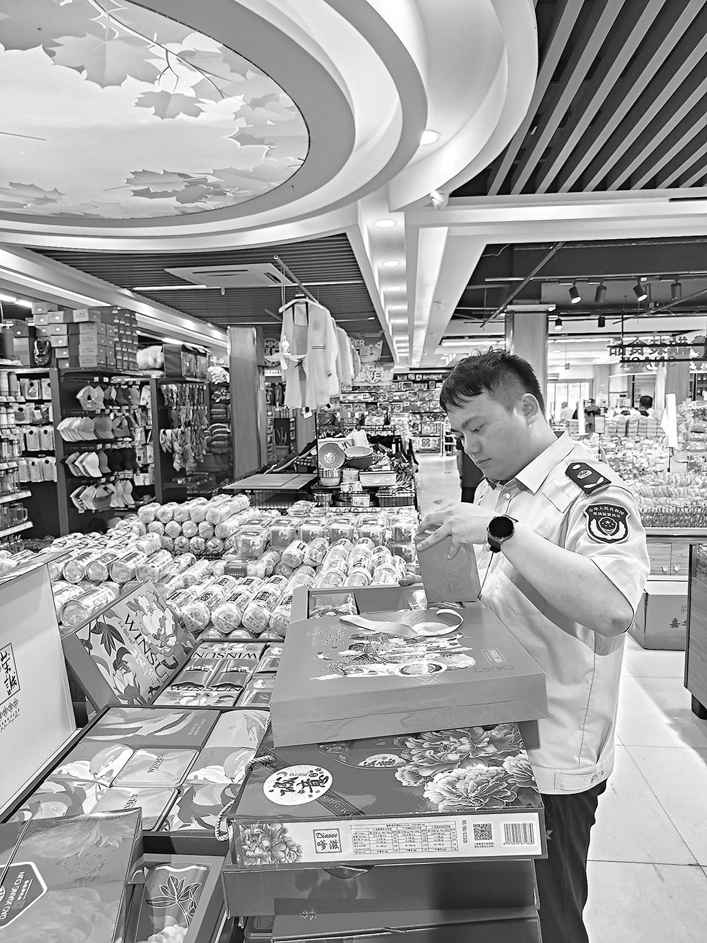 近日,江蘇省如皋市市場(chǎng)監(jiān)管局執(zhí)法人員對(duì)轄區(qū)內(nèi)月餅生產(chǎn)企業(yè)、超市開(kāi)展專項(xiàng)檢查。圖為執(zhí)法人員正在超市檢查月餅包裝標(biāo)識(shí)。鞠金龍 陳 偉 文/攝