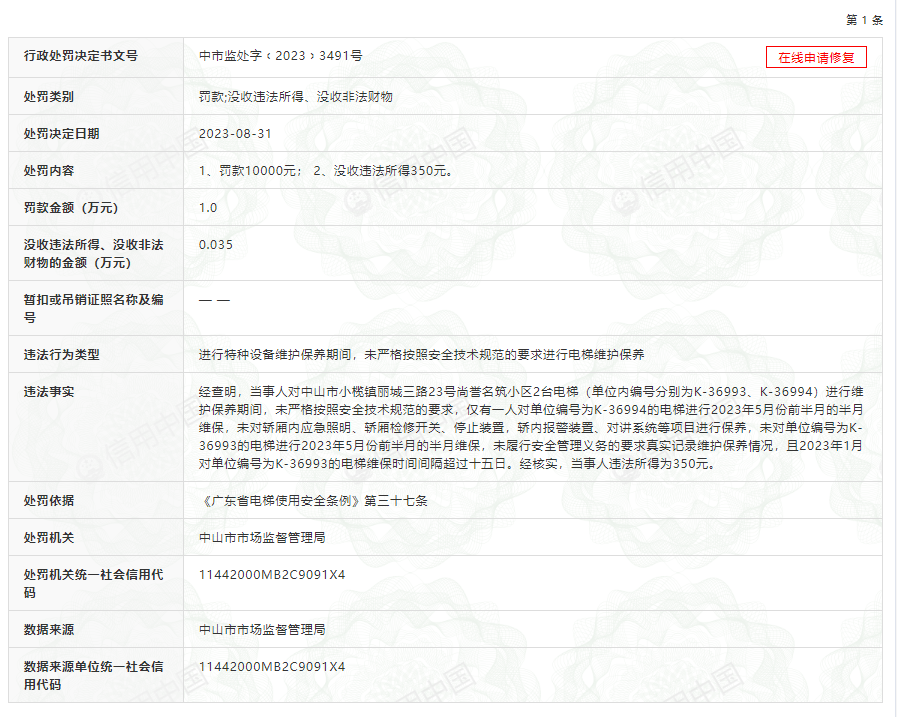 中山市市場(chǎng)監(jiān)督管理局依據(jù)《廣東省電梯使用安全條例》第三十七條,對(duì)該公司1、罰款10000元;2、沒收違法所得350元。