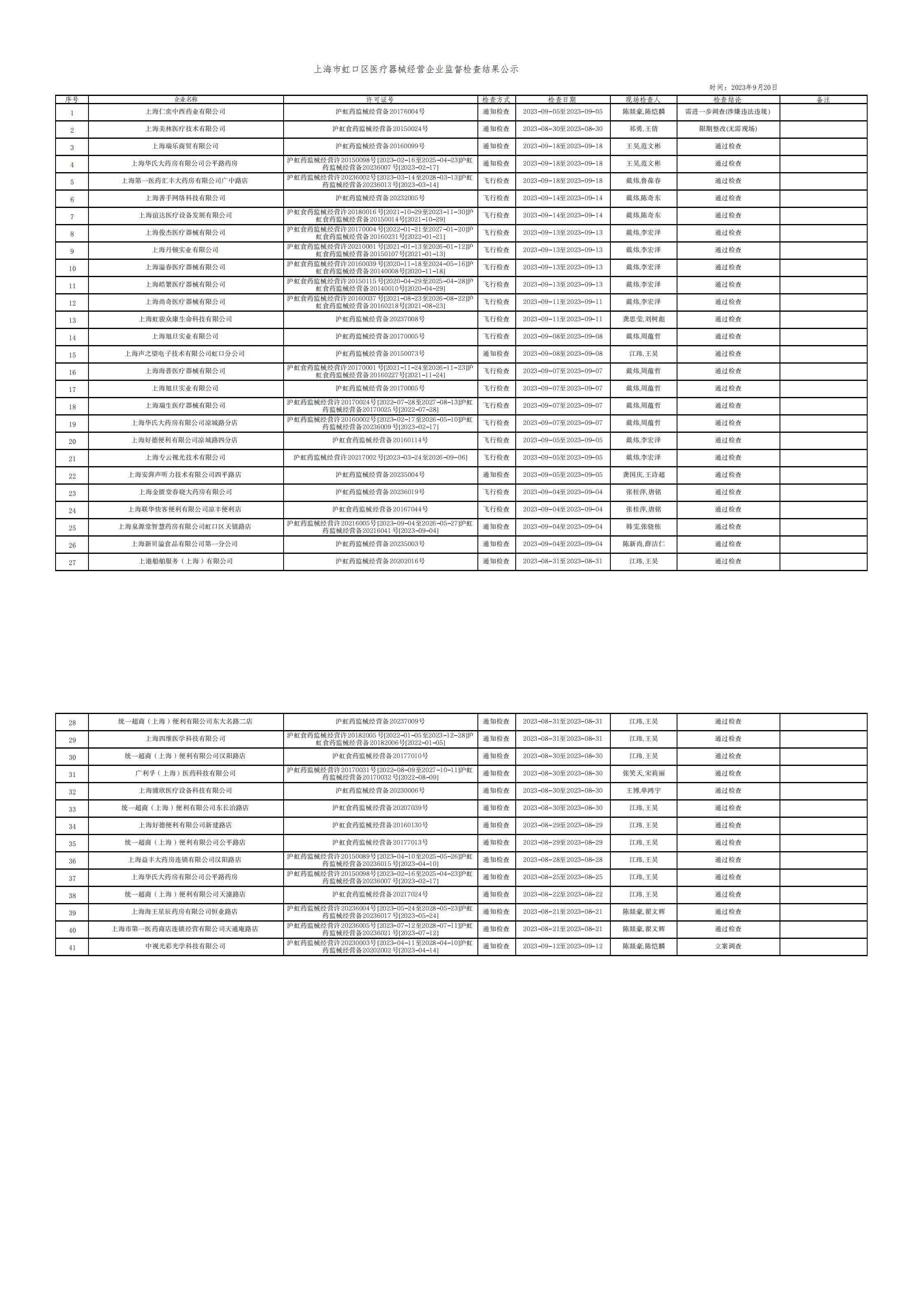 中國質(zhì)量新聞網(wǎng)訊 上海市虹口區(qū)市場監(jiān)管局發(fā)布上海市虹口區(qū)醫(yī)療器械經(jīng)營企業(yè)監(jiān)督檢查結(jié)果公示(2023.9)。