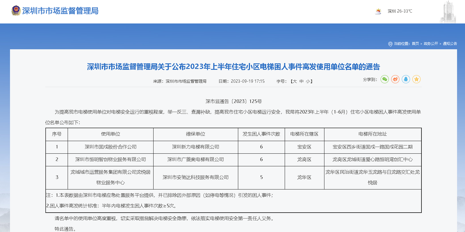 其中,作為使用單位的深圳市固戍股份合作公司、深圳市恒明智創(chuàng)物業(yè)服務(wù)有限公司、龍城城市運營服務(wù)集團有限公司龍悅居物業(yè)服務(wù)中心和作為維保單位的深圳新力電梯有限公司、深圳市廣菱奧電梯有限公司、深圳市安馳達科技服務(wù)有限公司等企業(yè)因發(fā)生困人事件次數(shù)超出困人事件高發(fā)統(tǒng)計標(biāo)準(zhǔn)而被深圳市市場監(jiān)督管理局公示。