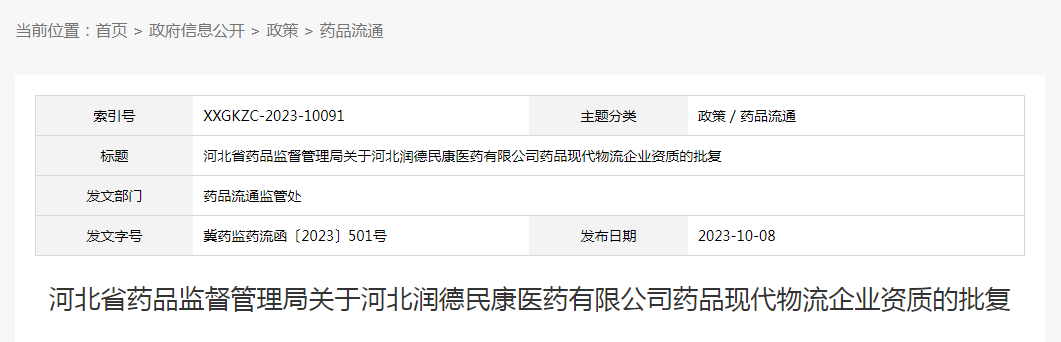 河北省藥品監(jiān)督管理局關(guān)于河北潤德民康醫(yī)藥有限公司藥品現(xiàn)代物流企業(yè)資質(zhì)的批復(fù)