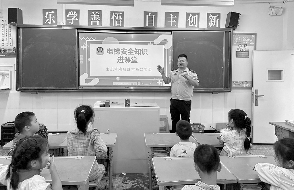 近日,重慶市涪陵區(qū)市場(chǎng)監(jiān)管局工作人員來(lái)到涪陵區(qū)荔枝希望小學(xué),開(kāi)展“電梯安全知識(shí)進(jìn)課堂”活動(dòng)。圖為工作人員正在為同學(xué)們普及乘坐電梯安全知識(shí)。文光輝 攝