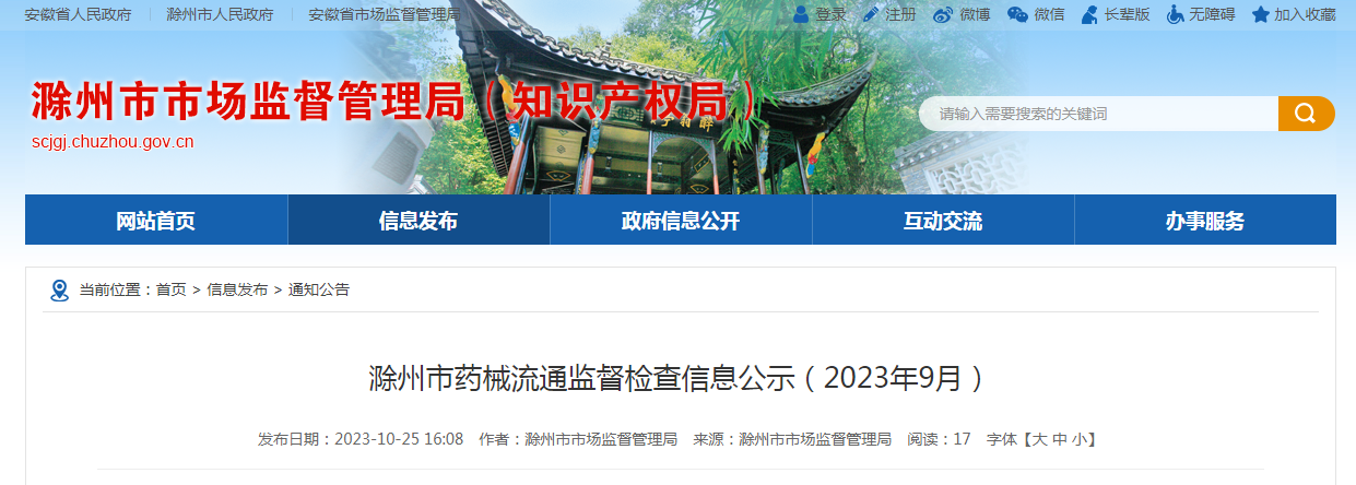 中國(guó)質(zhì)量新聞網(wǎng)訊 10月25日,安徽省滁州市市場(chǎng)監(jiān)督管理局網(wǎng)站公示2023年9月藥械流通監(jiān)督檢查信息。