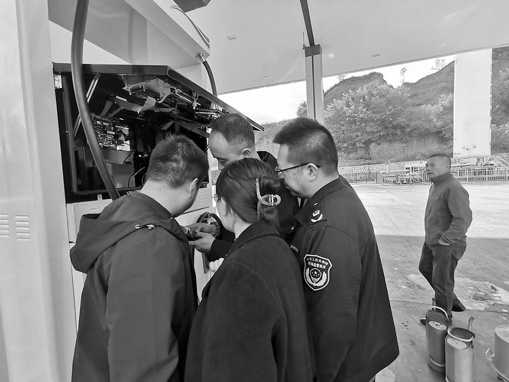 圖為執(zhí)法人員對轄區(qū)一家加油站加油機計量器具進行檢測。路彬彬 史安良 文/攝