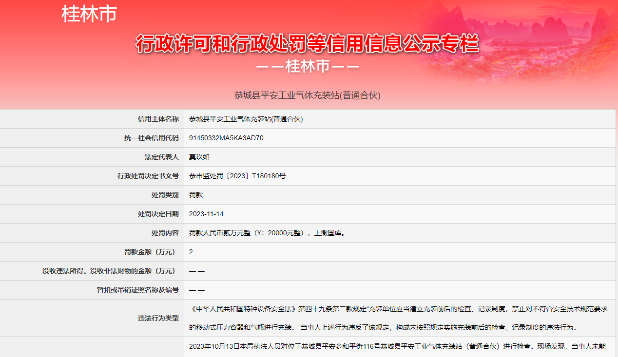 中國(guó)質(zhì)量新聞網(wǎng)訊(顧愛(ài)龍)近日,信用中國(guó)(廣西桂林)網(wǎng)站披露,恭城縣平安工業(yè)氣體充裝站(普通合伙)違反《中華人民共和國(guó)特種設(shè)備安全法》第四十九條第二款規(guī)定“充裝單位應(yīng)當(dāng)建立充裝前后的檢查、記錄制度,禁止對(duì)不符合安全技術(shù)規(guī)范要求的移動(dòng)式壓力容器和氣瓶進(jìn)行充裝”被罰。