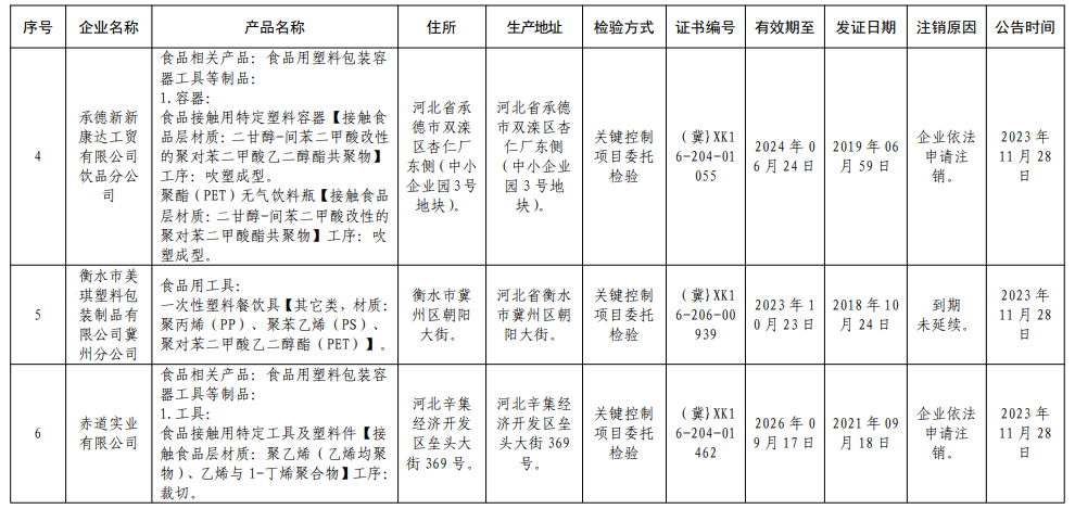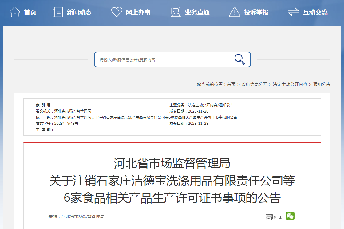 關(guān)于注銷(xiāo)石家莊潔德寶洗滌用品有限責(zé)任公司等6家食品相關(guān)產(chǎn)品生產(chǎn)許可證書(shū)事項(xiàng)的公告