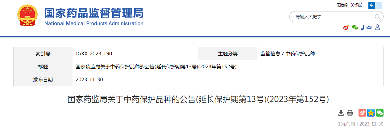 對(duì)重慶華森制藥股份有限公司的甘桔冰梅片、清華德人西安幸福制藥有限公司的生血寶合劑、山東漢方制藥有限公司的復(fù)方黃柏液涂劑、河南羚銳制藥股份有限公司的通絡(luò)祛痛膏、重慶希爾安藥業(yè)有限公司的麝香追風(fēng)止痛膏共5個(gè)中藥保護(hù)品種繼續(xù)給予2級(jí)保護(hù),其保護(hù)期限、保護(hù)品種編號(hào)分別為2023年11月27日—2030年1月19日、ZYB20720230130;2023年11月27日—2030年7月20日、ZYB20720230140;2023年11月27日—2030年7月20日、ZYB20720230150;2023年11月27日—2030年1月19日、ZYB20720230110;2023年11月27日—2030年1月19日、ZYB20720230120。