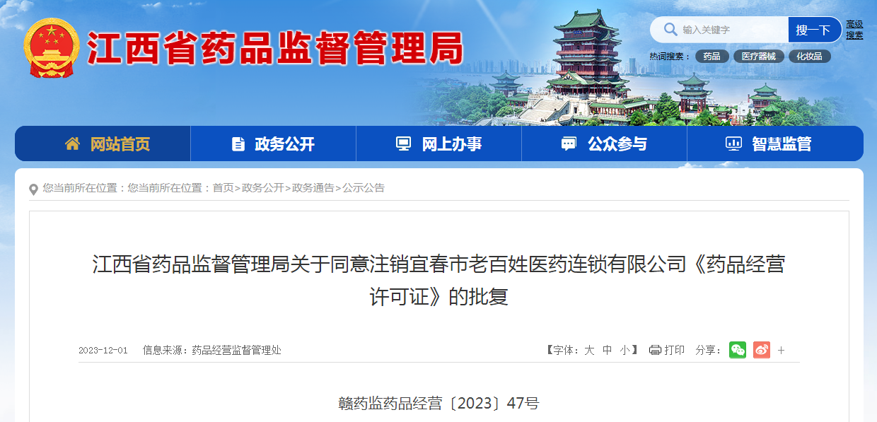 江西省藥品監(jiān)督管理局關(guān)于同意注銷宜春市老百姓醫(yī)藥連鎖有限公司《藥品經(jīng)營許可證》的批復(fù)