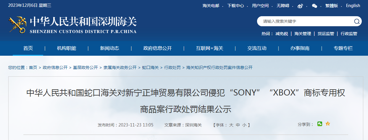 中華人民共和國蛇口海關(guān)對(duì)新寧正坤貿(mào)易有限公司侵犯“SONY”“XBOX”商標(biāo)專用權(quán)商品案行政處罰結(jié)果公示.pdf