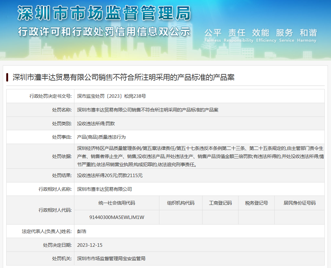 深圳市澧豐達貿(mào)易有限公司銷售不符合所注明采用的產(chǎn)品標(biāo)準(zhǔn)的產(chǎn)品案