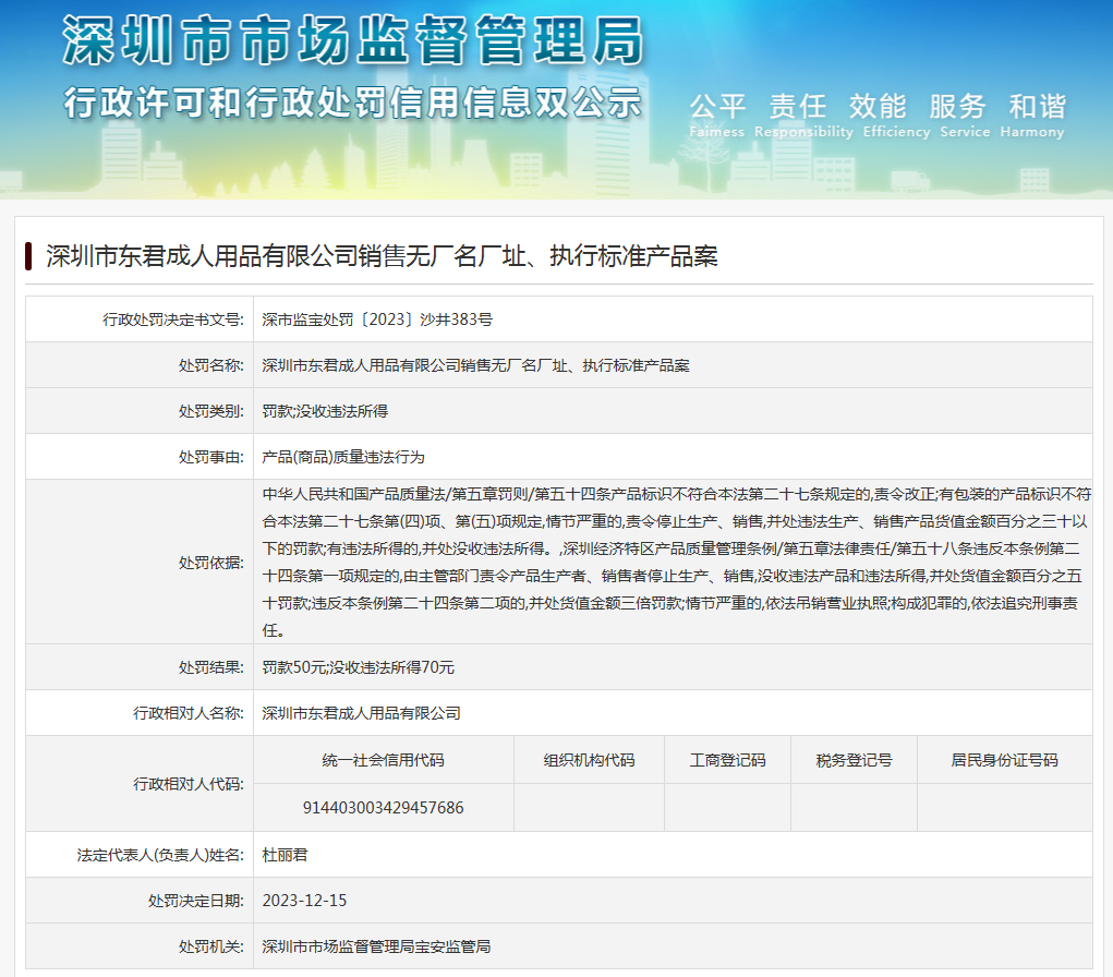 深圳市東君成人用品有限公司銷售無廠名廠址、執(zhí)行標(biāo)準(zhǔn)產(chǎn)品案
