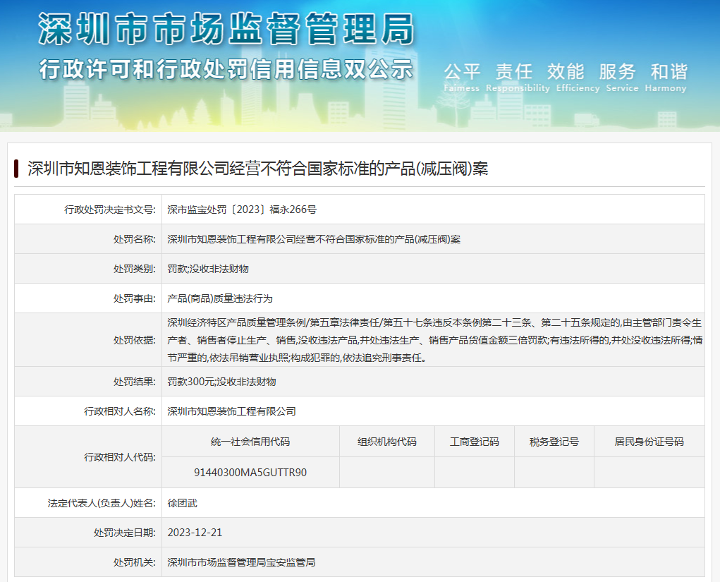 深圳市知恩裝飾工程有限公司經營不符合國家標準的產品(減壓閥)案