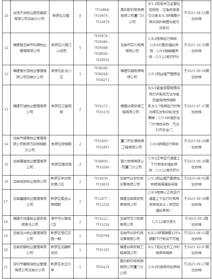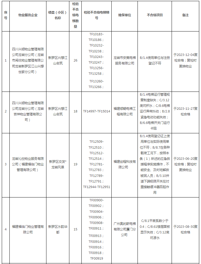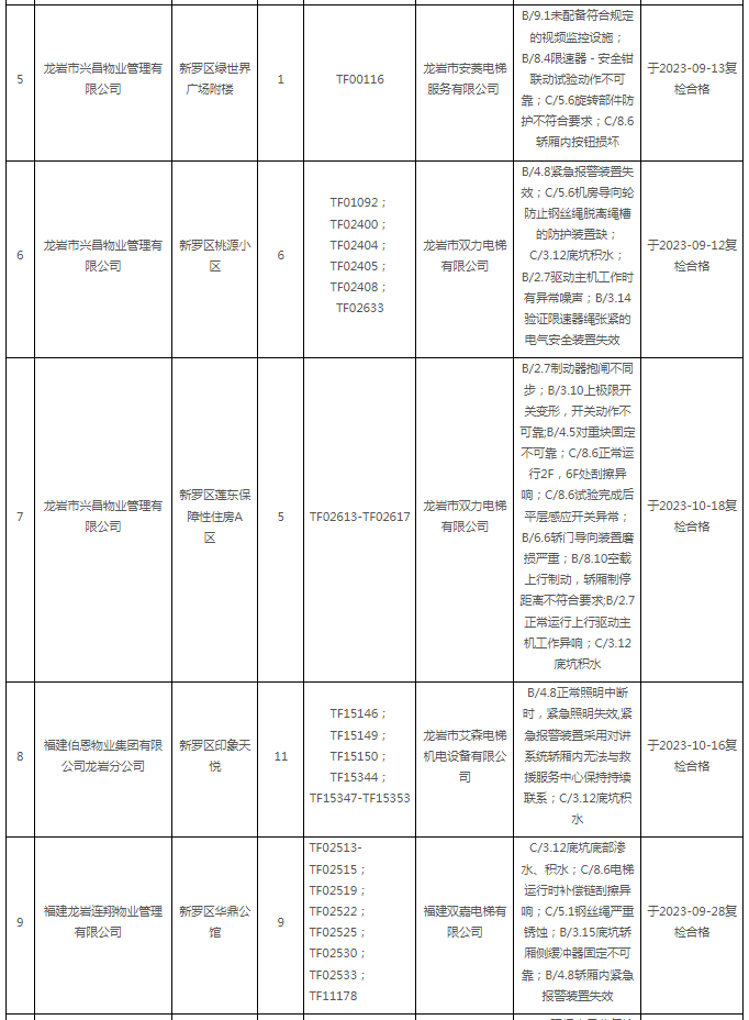 為促進(jìn)電梯安全管理水平和維保質(zhì)量運(yùn)行質(zhì)量提升,落實(shí)電梯使用管理單位及其維保單位的主體責(zé)任,保障電梯安全使用,結(jié)合我省電梯維保質(zhì)量信用體系建設(shè)方案要求,現(xiàn)對龍巖市2023年第3季度住宅電梯總體定期檢驗(yàn)情況,以及首次定期檢驗(yàn)不合格住宅電梯名單公布如下。